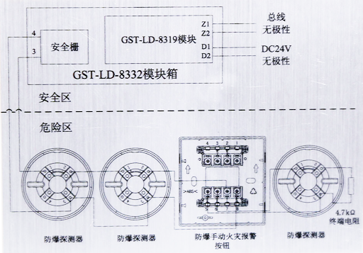 GST-LD-8332編址接口模塊(以下簡稱編址接口模塊)可與防爆設(shè)備(防爆感溫、感煙、煙溫復(fù)合探測器、防爆手動(dòng)報(bào)警按鈕等)配接,組成本安型防爆系統(tǒng)。一旦發(fā)生火災(zāi),編址接口模塊將報(bào)警信號(hào)通過總線傳入火災(zāi)報(bào)警控制器(以下簡稱控制器),控制器產(chǎn)生報(bào)警信號(hào)并顯示出編址接口模塊的報(bào)警地址信息。當(dāng)編址接口模塊本身出現(xiàn)故障時(shí),控制器將產(chǎn)生故障信號(hào)并顯示編址接口模塊故障地址信息。