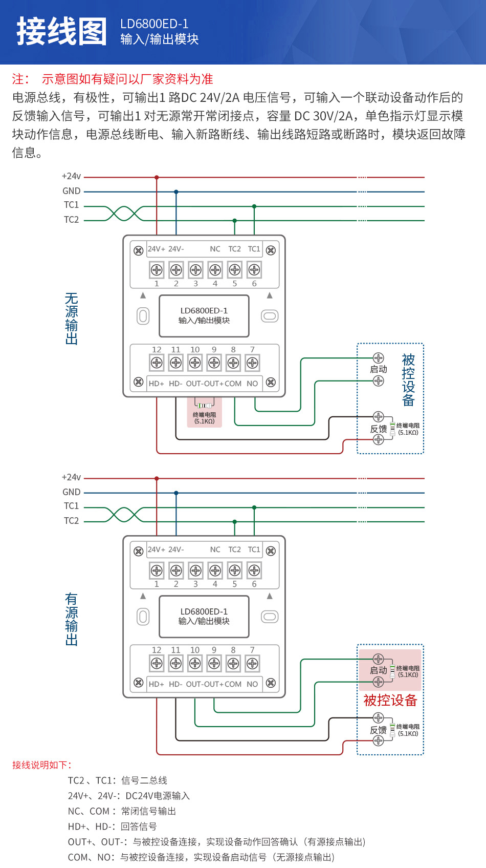 LD6800ED-1輸入/輸出模塊與E/EN/EL系列火災(zāi)報(bào)警控制器配合使用。LD6800ED-1輸入/輸出模塊通過二總線與E/EN/EL系列控制器連接,控制器通過二總線查詢模塊節(jié)點(diǎn)狀態(tài)、設(shè)置模塊節(jié)點(diǎn)參數(shù)、控制模塊啟動(dòng)輸出;模塊實(shí)時(shí)檢測(cè)輸入信號(hào)、輸入/輸出線路狀態(tài),當(dāng)出現(xiàn)反饋輸入或者輸入/輸出線路故障時(shí),模塊通過二總線上傳反饋或者故障信號(hào)。
