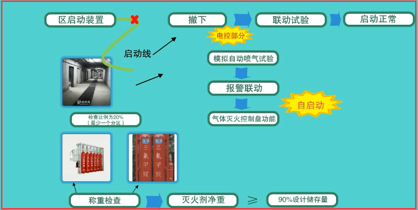 2、對每個(gè)防護(hù)區(qū)進(jìn)行一次模擬自動(dòng)噴氣試驗(yàn)。通過報(bào)警聯(lián)動(dòng),檢驗(yàn)氣體滅火控制盤功能,并進(jìn)行自動(dòng)啟動(dòng)方式模擬噴氣試驗(yàn),檢查比例為20%(少一個(gè)分區(qū))。