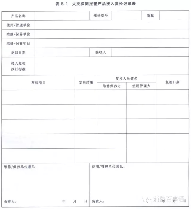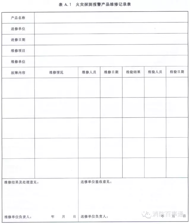 3.1.6承擔維修的企業(yè)應(yīng)做好維修記錄,與產(chǎn)品使用或管理單位各執(zhí)一份,并保存至該產(chǎn)品報廢。火災(zāi)探測報警產(chǎn)品維修記錄表的格式參見附錄A。