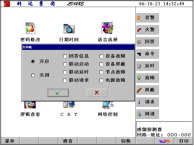 利達(dá)128E II火災(zāi)報(bào)警控制器在本頁可完成打印機(jī)的操作。畫面下方顯示打印機(jī)當(dāng)前狀態(tài)。